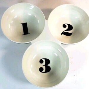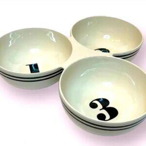 Kate spade raise a glass trio bowl set. Three connected bowls, numbered 1,2,3. Perfect for serving snacks or dips at a party! Bowls are white with black rim.