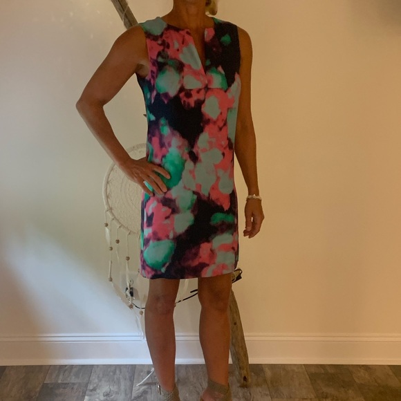 Worn once, gorgeous blends of Aqua, purple, green and Fuschia, super comfortable too! Is a size 2 that has been tailored to a 0.