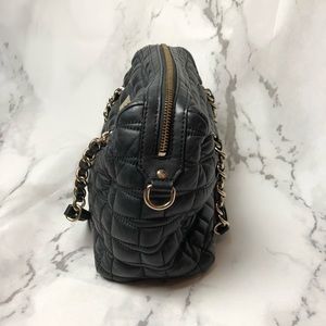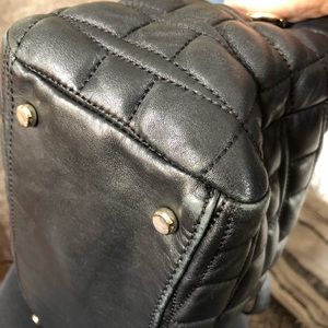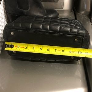 Small black stitched purse. Shows signs of wear on edges and interior but no holes or major wear. Has handles for attaching a crossbody strap although strap not included. Can provide measurements for serious buyers. Don’t hesitate to ask questions
