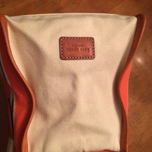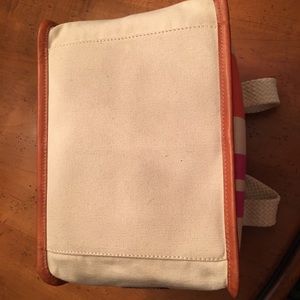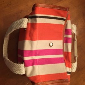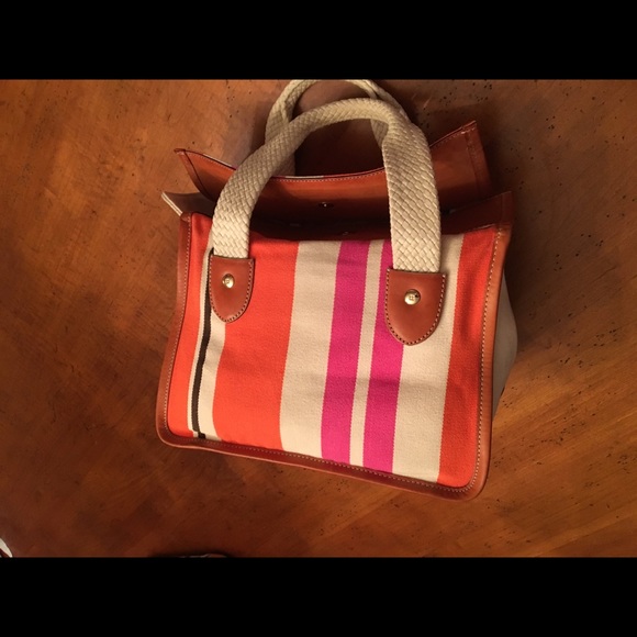 I purchased this from VonMaur Indy store and used it only a few times. This bag is an orange white pink with one black stripe canvas with leather trim. The inside is solid white canvas with 2 zip compartments and no stains.