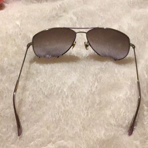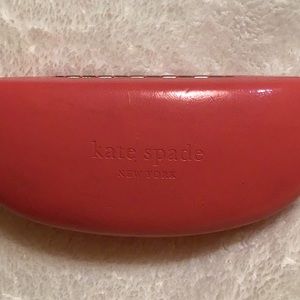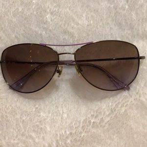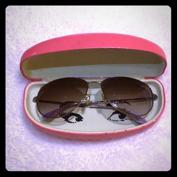 Sunglasses with slight Smokey purple tone. Really beautiful well made sunglasses from designer Kate Spade. I’m selling this pair of sunnies along with the whimsical Kate spade vibrant pink case. Once I left these in my living room and my puppy started teething on the arms of the glasses. Very minor damage