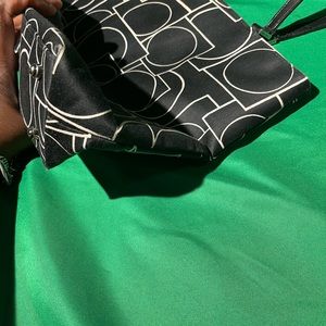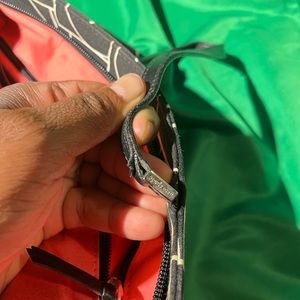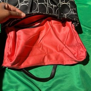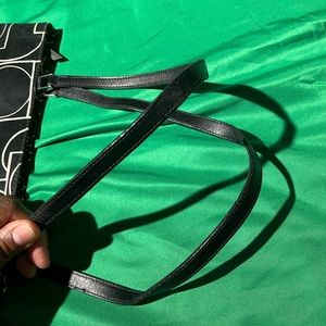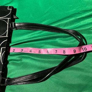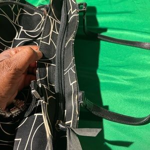 Black and white bag, fabric bag and leather straps, top zipper style bag, no rips, no tears indicated inside bag on pictures, minimal stains on interior , minimal stains on exterior, color shows signs of use noted on pictures, zipper closure, all hardware in tact, shoulder/handheld straps, check straps, check pictures for measurements and infractions, top zipper style bag, handles show signs of use, purse shows signs of use, check purse for authenticity