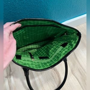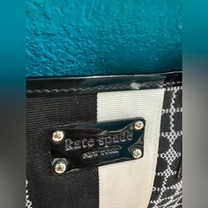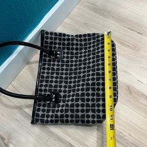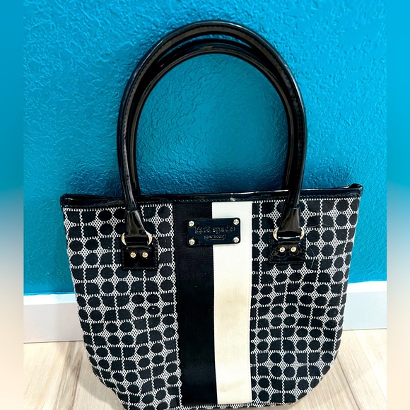 This is a super cute tote bag from the brand Kate Spade. Colors are black and white and green interior. Measurements in pics. Excellent condition except for small scuff as shown in last pic