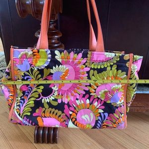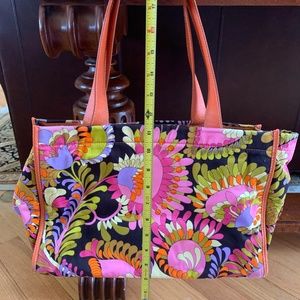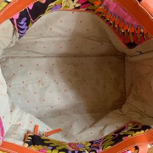 good used condition, bright paisley pattern, orange leather trim