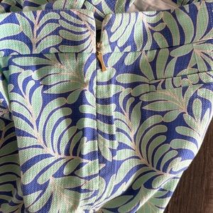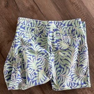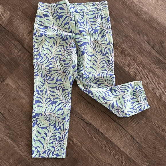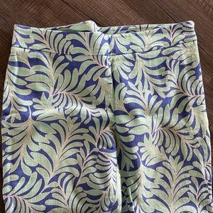 Pretty leaf print capri pants from Kate Spade . Size 12 runs true to size . Has a side zip with bow detail zipper pull . Made of cotton and 3% elastane. There is a pretty waffle texture to the fabric .
