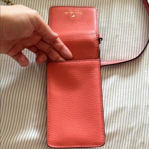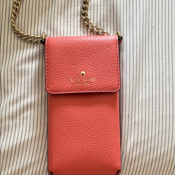 Stylish coral crossbody bag by Kate Spade. Features a gold chain strap.