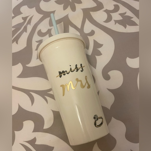 Elegant Kate Spade cream tumbler with gold ‘miss’ to 'mrs' design and ring graphic. Perfect for the Bride to Be!