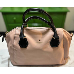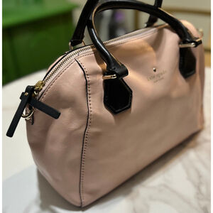 This is a Kate Spade New York Catherine Street Pippa satchel bag in pink leather with black handle Interior clean