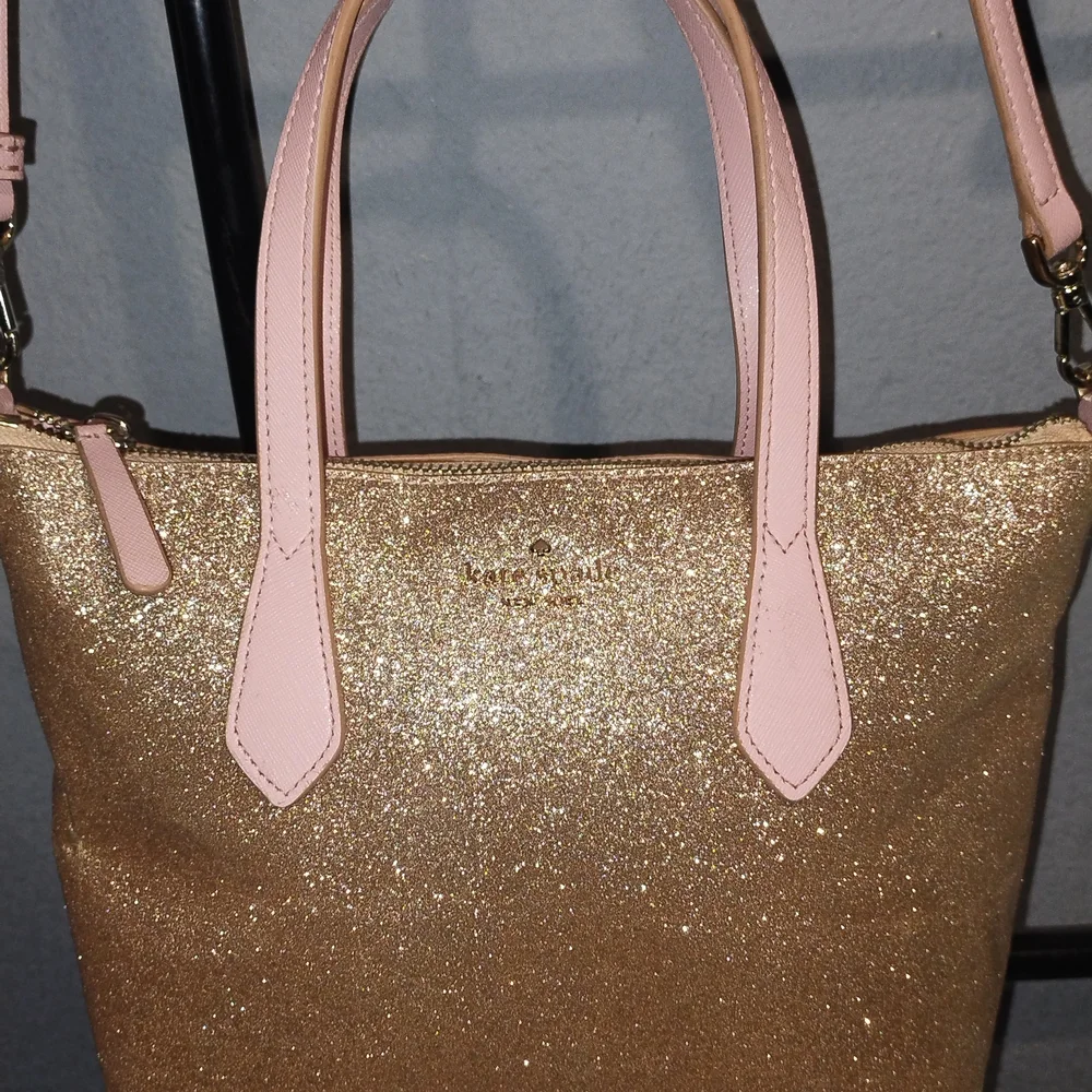 this is a kate spade from the discontinues sparkle collection. this came to me as a rehab and I am selling the completed project.there is call out. in pics u will see small black dots 2of them it is from the edge oil.. ... they are extremely minute and cannot be seen when looking at the bag ... u have to look for them.