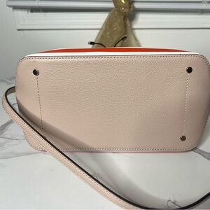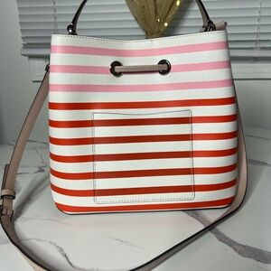 This chic Kate Spade shoulder bag showcases a stunning ombré stripe design in pink and red hues. Crafted with a structured silhouette, it features a convenient drawstring closure, making it perfect for everyday use. The vibrant color palette adds a fresh and stylish touch to any ensemble.