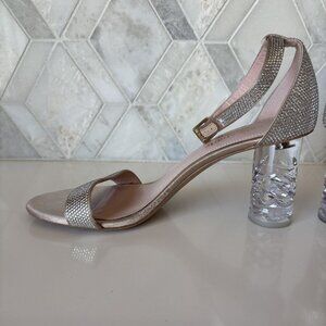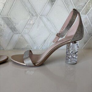 This is a pair of Kate Spade sandals in size 9B. These sandals are an absolutely stunning example of Kate Spade footwear, bringing the typical feel of Kate Spade with adventurous and fun decorations to completely transform these from being typical block heel sandals. The upper of these sandals is made of textile materials, and is entirely covered in sparkling, glistening crystals, making them beautifu, bold, and eye-catching when worn! These sandals have a strap at the front to secure them to the wearer's foot, and have a convenient pad at the back for a better fit and comfort, as well as a strap at the top which can be adjusted to the wearer's needs. These sandals also feature a unique cylindrical heel, crystalline in appearance, which reflects light brilliantly and perfectly complements the overall style of the shoes! The insole is a soft and padded leather, and the outsole is also made of durable, genuine leather! The bottom of the heel has a small cylinder of a different material. The heel is about 3.5 inches tall. These shoes are in nearly pristine condition unanimously, being brought down only by some minor discoloration at the top of the strap connection of one of the sandals, and some marks on the leather on the bottom, not including sticker residue. Never worn, see pics.