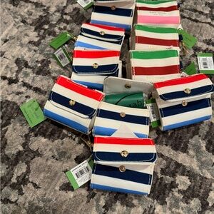 Kate spade Colorful striped dog waste bag holder with a convenient clip. Features red, blue, and white stripes.