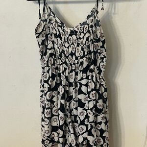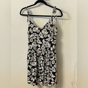 Kate Spade New York Aliso Adjustable Shoulder Tie Romper. Size Medium. Retail price $135. Adjustable spaghetti tie straps with gold signature logo spades. Black white and maroon floral print. Pull on style. V neck neckline. Elastic at back waist. On seam side hip pockets