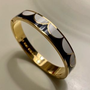 Scallop enamel white/back/gold hinged bangle by Kate Spade. Almost like new except there’s a little blemish inside the bangle, which does not affect the function/beauty of the piece. On the inside the inscription says “all the trimmings”