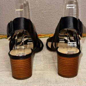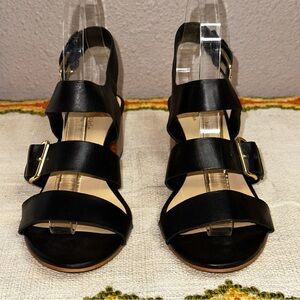 Kate Spade heeled sandals are in good used condition, one small blemish at the tip of the toe, please see pictures for details. They feature gold hardware which is in good condition and the heel measures 2 inches. Comment for any questions, thanks.