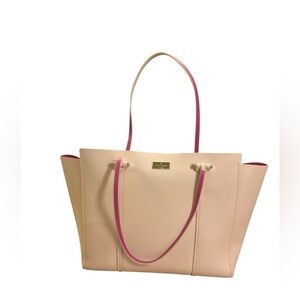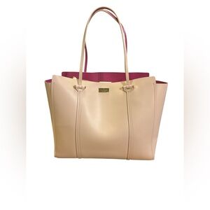 Chic light pink/fuchsia tote by Kate Spade. Great condition, very minor wear inside bag. Features elegant gold detailing. Smooth leather inside and out. No separate lining. One interior zipper pocket and 2 inside pockets. 18" across top tapers to 14.5 " at bottom. Height 12.5", Depth 5.25", Strap drop 9". Smoke free home.