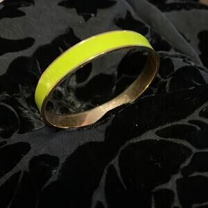 Super cute and preppy apple green and gold Kate Spade bangle with “THE APPLE OF YOUR EYR” stamped inside! Perfect for the office, to dress up a nice outfit, etc. I don’t see any noticeable damage although I did wear and love her. I just don’t wear bangles much these days, and she deserves to be in a home where she’s loved! Wear alone or stack a few to make a statement!