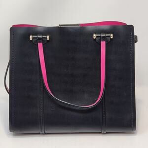Kate Spade New York Arbor Hill Kyra black and hot pink leather handbag crossbody purse, top handle, adjustable buckle removeable crossbody strap, inner zipper pocket divider, inner slip pocket, magnetic closure, silver tone metal logo