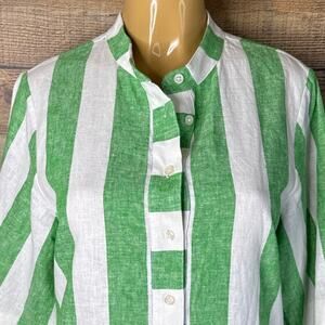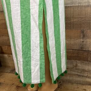 Kate Spade Awning Stripe Pom-pom Tunic Dress. Style# K8520. Size medium. Color ~ Green/White. Awning Stripe print. Woven linen blend fabric. Banded collar. Three-quarter-length wide sleeves. Pom-pom trim at sleeves and hem. Center front half button placket. Side pockets. New without tags. Measurements are in the pictures.
