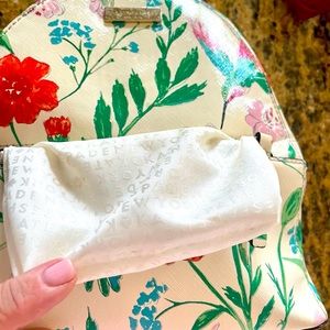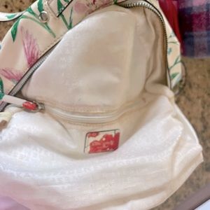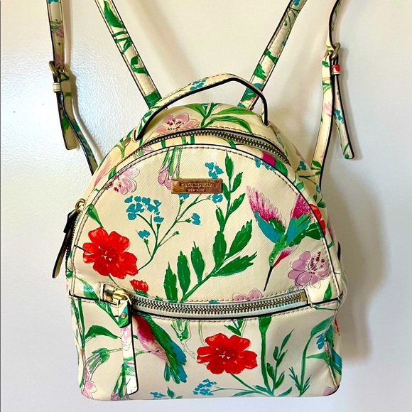 This backpack is water resistant! Zipper pouch in front. There is some staining on the inside but not bad.