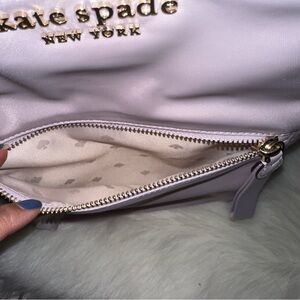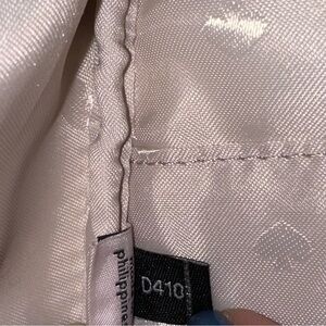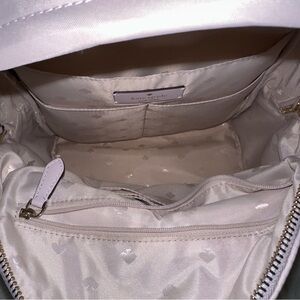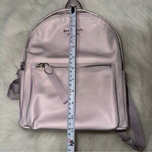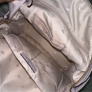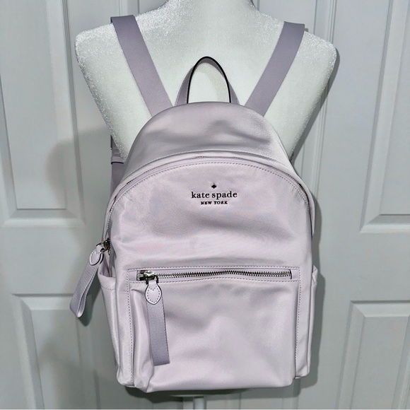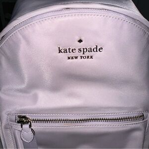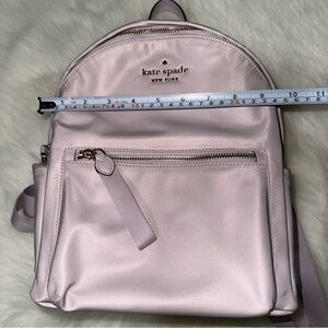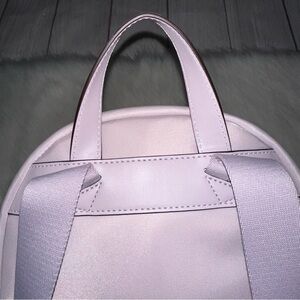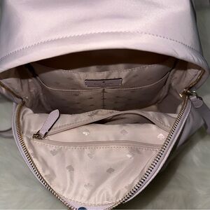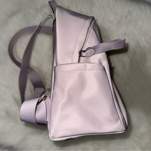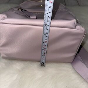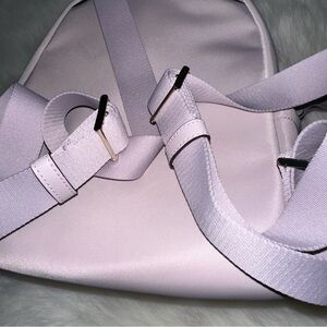 Size S. Heavyweight. Soft smooth material. Pastel purple/lavender color with gold hardware. Fully lined inside. One zip pocket in front. One zip pocket inside. Tons of pockets inside. Side pockets. Adjustable cloth straps. Super cute. Used few times.