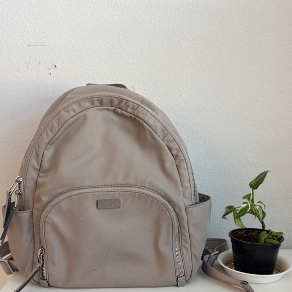 This sleek gray backpack is perfect for everyday use. Its modern design and durable material make it a must-have accessory. Plant included for size reference.