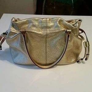 Gold leather, copper trim on 3 inside pockets. Aprx: 14x11x6. Silver hardware for feet on bottom. EUC. Width adjustable by side cinchers. Dust bag. Great for Fall.