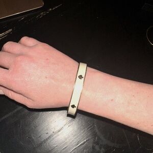 White & Gold Kate Spade Bangle/Bracelet, bracelet slips on over wrist, not a clasp, is 2.6 inches big and the bracelet itself is about .4 inch in width., has 6 gold colored spades spanning across the entire bracelet with white background. Inside of the bracelet says Kate Spade New York. No scuffs or wear to note on the outside of the bracelet.