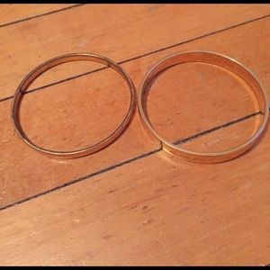 Set of 2 Kate Spade bangles. One is thinner and plain gold with minimal tarnish. The other is a bit thicker and has inscriptions. Inside reads "this is the year to" and outside reads "wear red," "dance till dawn," "be a firecracker," "embrace color," etc. and is still bright and can be described as gently used. By kate spade NY inscribed inside both.