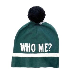 Description: Knit beanie winter hat featuring an owl on one size an the words “Who Me?” on the other. Pompom on top, ribbed cuff on bottom.
