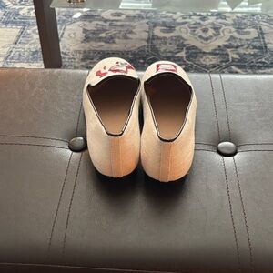 Stylish beige loafers featuring a fun ketchup design. Perfect for adding a playful touch to your outfit.