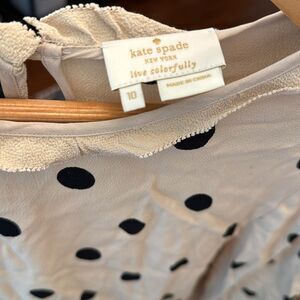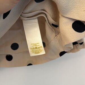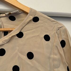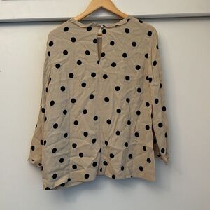 Chic beige blouse with bold black polka dots. Features long sleeves and a keyhole back. Ideal for versatile styling.