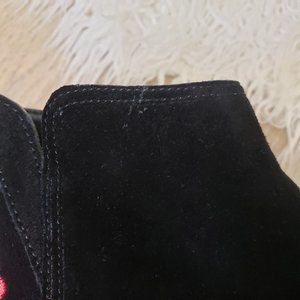 Chic black booties with vibrant pink embroidered floral accents. Easy side zipper. Stylish and versatile.