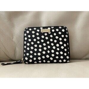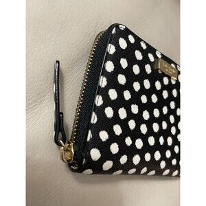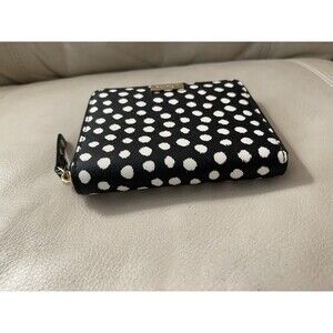 This Kate Spade wallet is a stylish and functional accessory for women. It features a classic polka dot pattern in black and white, with a zip-around closure for security. It includes convenient credit card slots and a folding design for easy storage in your bag. The Darci character adds a playful touch to this chic and practical accessory from the renowned Kate Spade brand. It is super CUTE!
