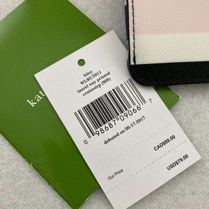 Kate Spade "Bitsy" Cruise Stripe card holder/coin purse. This kate Spade card holder/coin purse in "Cruise Stripe" black, blue, pink and white. It has 4 card holders on the back, zip pouch for coins, gold tone zip and key holder. It is NWT, but there is a mark on the back as shown in photos. I purchased two together and a slight imprint has been left on this one unfortunately. Measurements approximately: 3.5" x5". From smoke/pet-free home. Please feel free to ask if you have any questions.