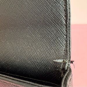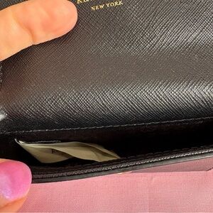 Chic black card holder by Kate Spade. Features a gold logo plate. Preowned and shows some cracking on inside corners (see pics) that doesn’t impact function. Outside is perfect.