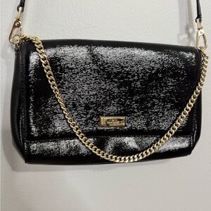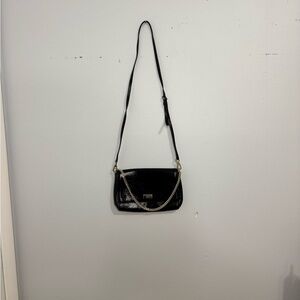 Chic black crossbody purse. Patent leather for sleek look. Features a stylish gold chain strap. Ideal for day or night outings.