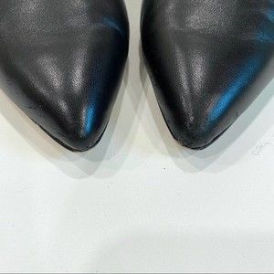 Mary Jane Stiletto Heels / Pumps with Double Adjustable Buckles on White Leather Straps. 3.75" Black Glitter Covered Stiletto Heel. Cushioned Padded Leather Footbed. Leather Upper & Sole. Color: Black. Size: US 9. Made in Italy. Includes original box. Some wear on the inner heels and toes - see last three photos for details.