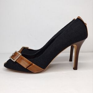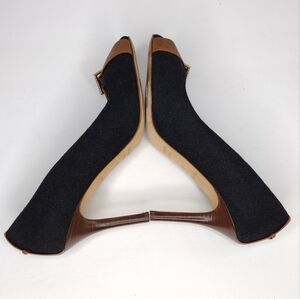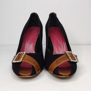 Kate Spade Black Felt Fabric Leather Rhinestone Office Open Toe Heels Size 9B .
