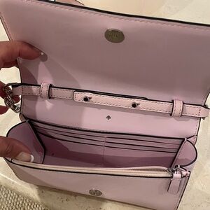 Elegant crossbody with bold black floral pattern. Soft pink background. Silver chain strap adds a modern touch.