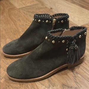 These chic black ankle booties from Kate Spade feature fringe detailing and metal stud embellishments, offering a stylish blend of Western and bohemian influences. The low stacked heel and almond-shaped toe ensure comfort and versatility, making them perfect for everyday wear. Never worn.
