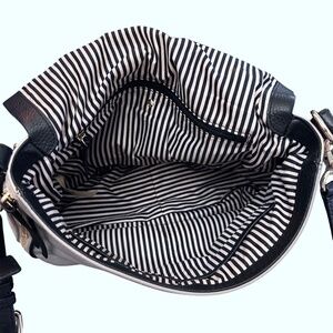 Fully lined black and white striped fabric interior with one zipper pocket + 2 open slip pockets