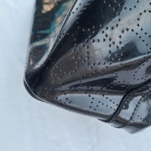 Details: Glossy PVC patent outer with perforated hearts; zip top closure; gold-tone hardware; tan-gold fabric lining; multiple interior pockets; signs of use such as scuffing, but no holes, tears, or smells; clean inside