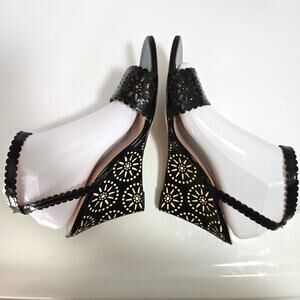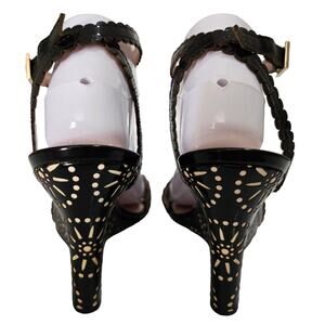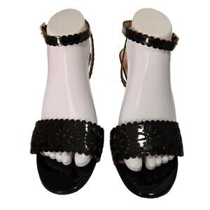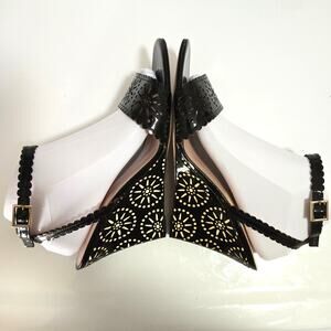 Kate Spade Black Iago Patent Leather Laser Cut Wedge Sandal Ankle Strap Open Toe