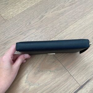 This Kate Spade large continental wallet offers a sophisticated black saffiano leather exterior with a vibrant, colorful striped interior.