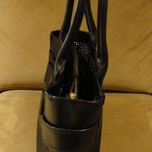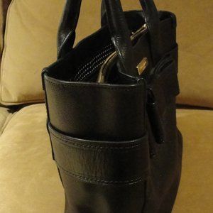 Exceptional, like new condition Kate Spade NY Quinn Villabella Black leather Bow Handbag. Gold hardware of Kate Spade logo, 7" double handles, and a large bow on the front of the bag. The interior of the satchel bag is a black and white satin polka dot, zippered middle divider, zippered back pocket and 2 slide pockets. Accompanying the bag is the brown dust cover bag with the saying "she tucked her coral lipstick away and floated back to the party" kate spade NEW YORK Measures approx. 11.5"w x 9.5"h x 5.5"w - 7" handles.