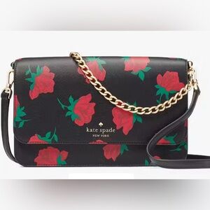 Elegant black crossbody bag with gold chain detail. Features iconic spade logo. Ideal for versatile styling. Comes with COA.