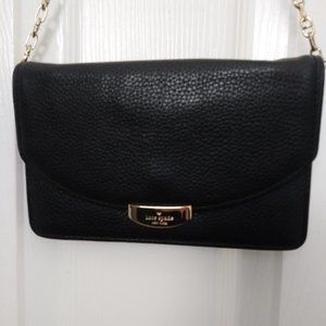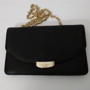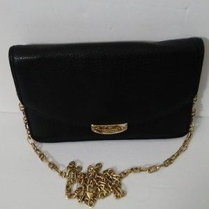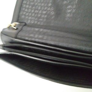 • 4.5" H x 7" L x 1" D strap drop: 15" with spade gold tone mounted plate logo. Fabric lining