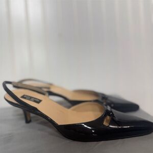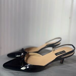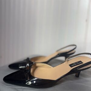 Channel timeless elegance with these Kate Spade New York slingback heels, crafted in Italy from sleek black patent leather. These classic pointed-toe shoes feature a cutout vamp with a dainty bow detail and a comfortable kitten heel for effortless style.