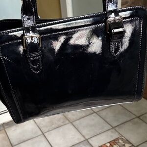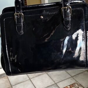 Classic and chic Kate Spade patent leather tote in glossy black.